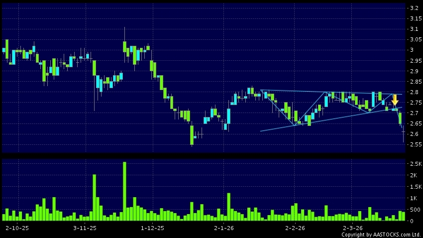 三角形向下突破是指股價的波幅漸漸收窄,在圖表上形成三角形般的狀態。股價在三角形的末端向下突破,下跌趨勢形成,技術走勢偏軟。(港股報價延遲最少十五分鐘。)