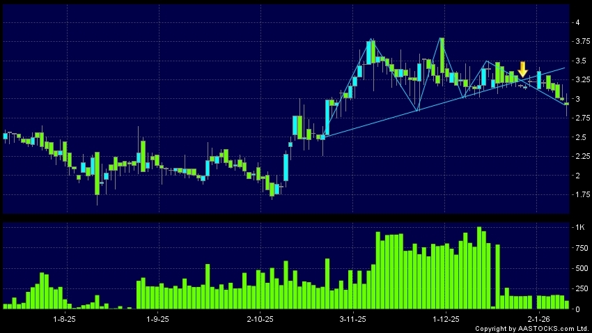 頭肩頂是典型的沽出訊號,當股價跌穿支持線(頸線)時,跌勢確認股價將持續下跌,技術走勢偏軟。(港股報價延遲最少十五分鐘。)