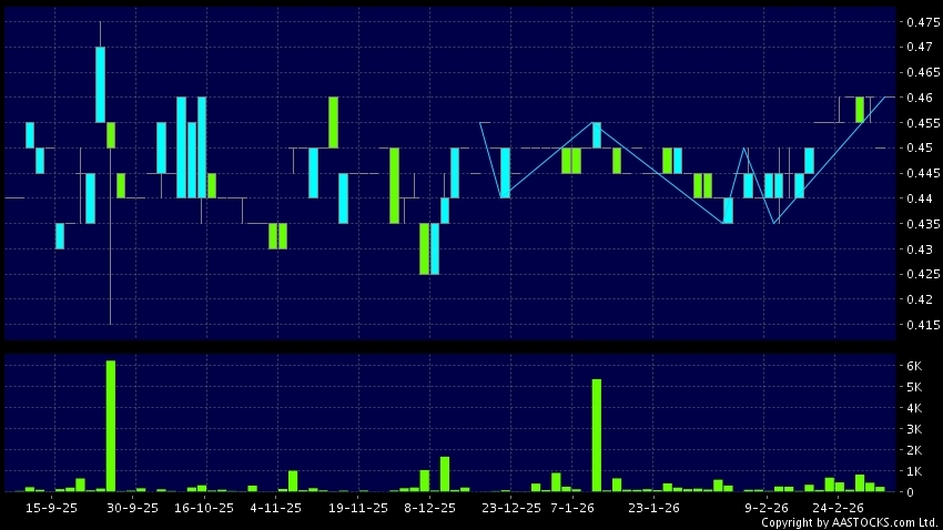 嘉濤(香港)控股(02189.HK) 0.000 (0.000%) 呈現三重底突破向上。現價報0.460,上升2.222%,成交量2.40萬股,成交額1.10萬。
