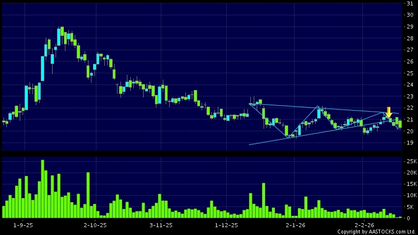 三角形向下突破是指股價的波幅漸漸收窄,在圖表上形成三角形般的狀態。股價在三角形的末端向下突破,下跌趨勢形成,技術走勢偏軟。(港股報價延遲最少十五分鐘。沽空資料截至 2026-03-03 16:25。)