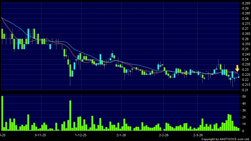 羚邦集團(02230.HK) +0.002 (+0.893%) 10天移動平均線跌穿20天移動平均線,出現死亡交叉。現價報0.223,上升0.450%,成交量42.50萬股,成交額9.58萬。