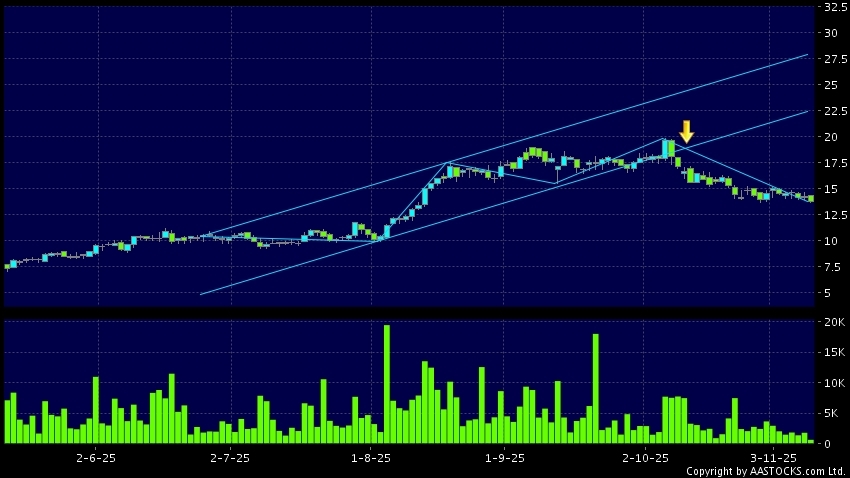 區域突破指股價在過去的一段時間只在一個範圍在內活動,然後股價下跌作出突破,跌穿區域的底部,技術走勢偏軟。(港股報價延遲最少十五分鐘。沽空資料截至 2025-11-19 16:25。)