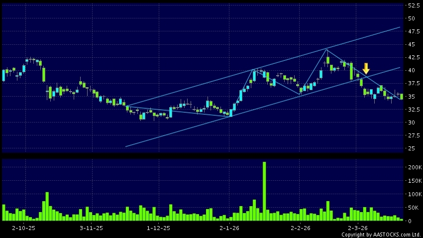 區域突破指股價在過去的一段時間只在一個範圍在內活動,然後股價下跌作出突破,跌穿區域的底部,技術走勢偏軟。(港股報價延遲最少十五分鐘。沽空資料截至 2026-03-19 16:25。)