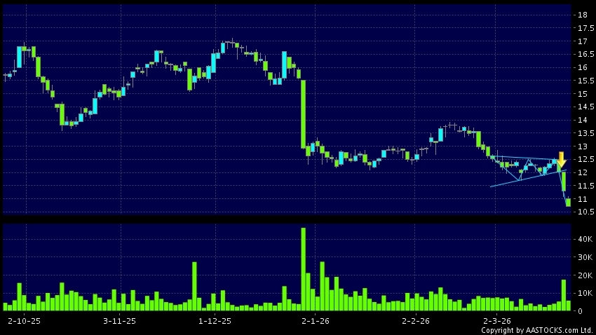 三角形向下突破是指股價的波幅漸漸收窄,在圖表上形成三角形般的狀態。股價在三角形的末端向下突破,下跌趨勢形成,技術走勢偏軟。(港股報價延遲最少十五分鐘。沽空資料截至 2026-03-23 16:25。)