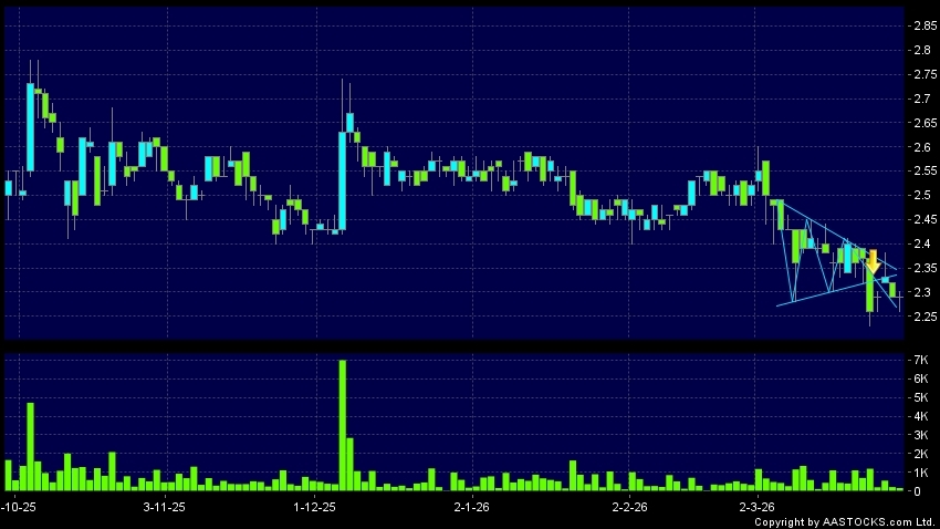 三角形向下突破是指股價的波幅漸漸收窄,在圖表上形成三角形般的狀態。股價在三角形的末端向下突破,下跌趨勢形成,技術走勢偏軟。(港股報價延遲最少十五分鐘。)