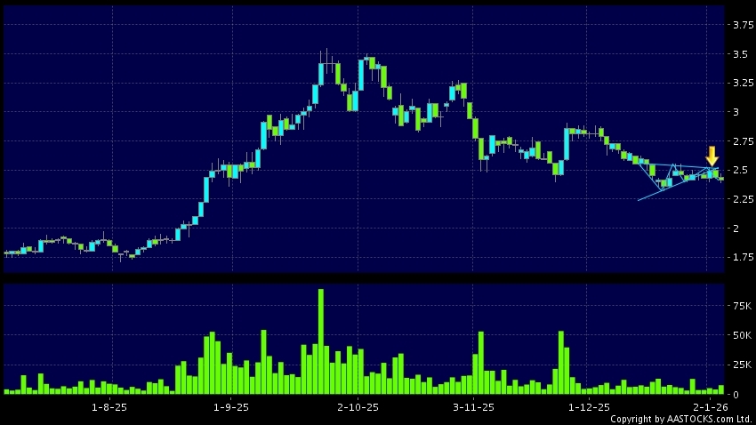 三角形向下突破是指股價的波幅漸漸收窄,在圖表上形成三角形般的狀態。股價在三角形的末端向下突破,下跌趨勢形成,技術走勢偏軟。(港股報價延遲最少十五分鐘。沽空資料截至 2026-01-16 16:25。)