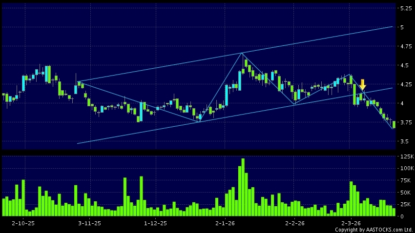 中航科工(02357.HK) -0.090 (-2.466%) 沽空 $2.75千萬; 比率 19.445% 呈現區域下軌突破。現價報3.670,下跌2.910%,成交量1.74千萬股,成交額6.43千萬。