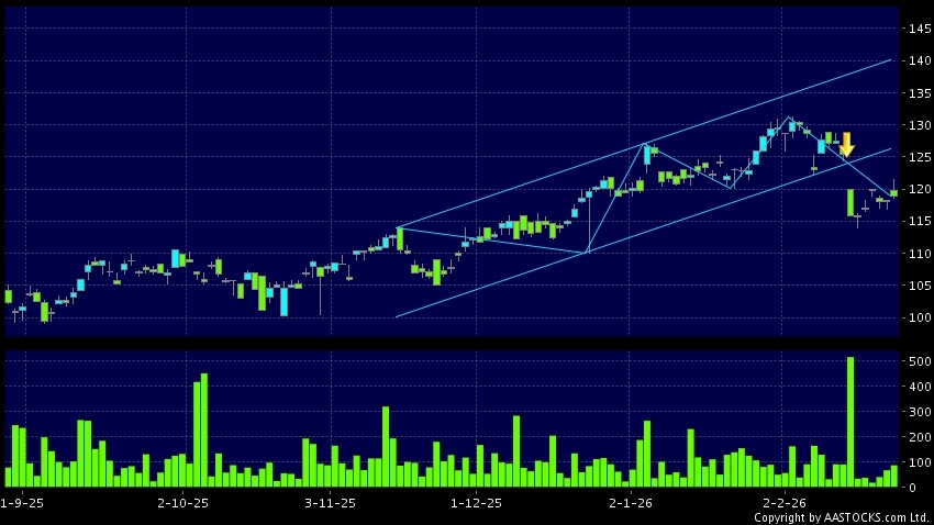 區域突破指股價在過去的一段時間只在一個範圍在內活動,然後股價下跌作出突破,跌穿區域的底部,技術走勢偏軟。(港股報價延遲最少十五分鐘。沽空資料截至 2026-02-27 16:25。)