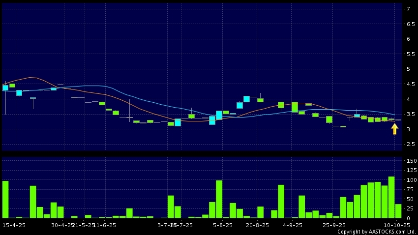子不語(02420.HK) +0.050 (+1.502%) 10天移動平均線升穿20天移動平均線,出現黃金交叉。現價報3.300,下跌0.602%,成交量4.65萬股,成交額15.38萬。