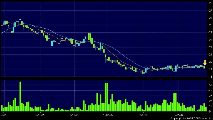 萬物雲(02602.HK) -0.060 (-0.314%) 沽空 $1.94百萬; 比率 13.688% 10天移動平均線跌穿20天移動平均線,出現死亡交叉。現價報19.050,下跌0.314%,成交量86.40萬股,成交額1.65千萬。