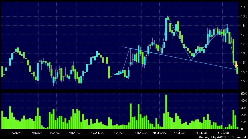 頭肩頂是典型的沽出訊號,當股價跌穿支持線(頸線)時,跌勢確認股價將持續下跌,技術走勢偏軟。(港股報價延遲最少十五分鐘。沽空資料截至 2026-03-18 16:25。)