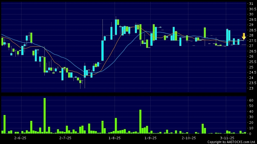 匯舸環保(02613.HK) -0.400 (-1.429%) 10天移動平均線跌穿20天移動平均線,出現死亡交叉。現價報27.120,無升跌,成交量2.80千股,成交額7.59萬。