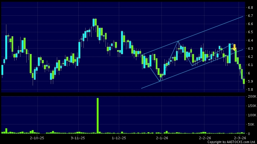環球醫療(02666.HK) +0.040 (+0.683%) 沽空 $2.59百萬; 比率 193.383% 呈現區域下軌突破。現價報5.870,下跌1.012%,成交量4.32百萬股,成交額2.53千萬。