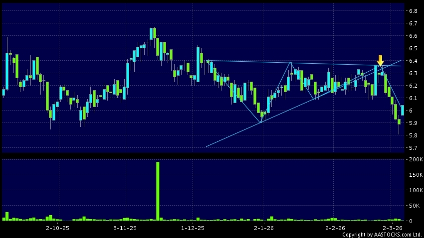 三角形向下突破是指股價的波幅漸漸收窄,在圖表上形成三角形般的狀態。股價在三角形的末端向下突破,下跌趨勢形成,技術走勢偏軟。(港股報價延遲最少十五分鐘。沽空資料截至 2026-04-02 16:25。)