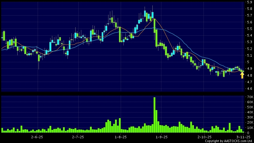 中海物業(02669.HK) 0.000 (0.000%) 沽空 $2.00百萬; 比率 6.406% 10天移動平均線升穿20天移動平均線,出現黃金交叉。現價報4.860,上升0.206%,成交量2.35百萬股,成交額1.14千萬。