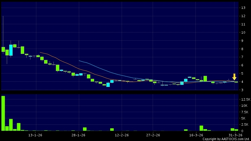 美聯股份(02671.HK) -0.050 (-1.205%) 10天移動平均線跌穿20天移動平均線,出現死亡交叉。現價報3.900,下跌4.177%,成交量62.64萬股,成交額2.44百萬。