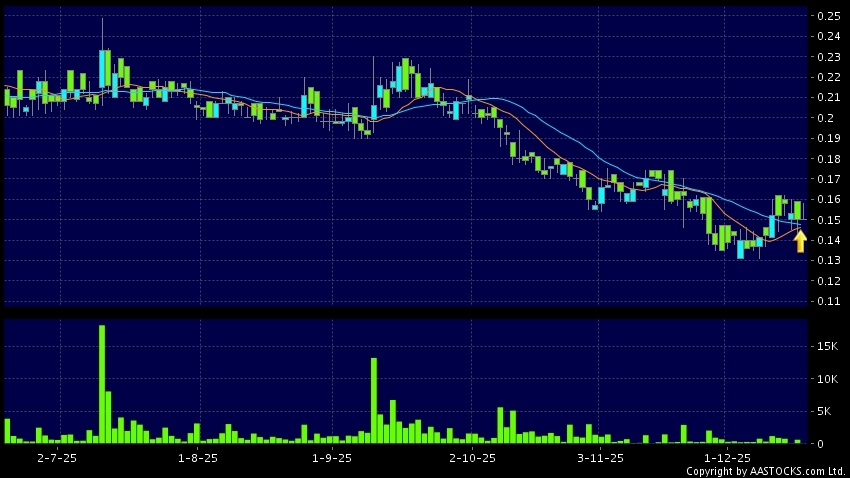 融信中國(03301.HK) -0.001 (-0.658%) 10天移動平均線升穿20天移動平均線,出現黃金交叉。現價報0.150,無升跌,成交量2.40萬股,成交額3.75千。