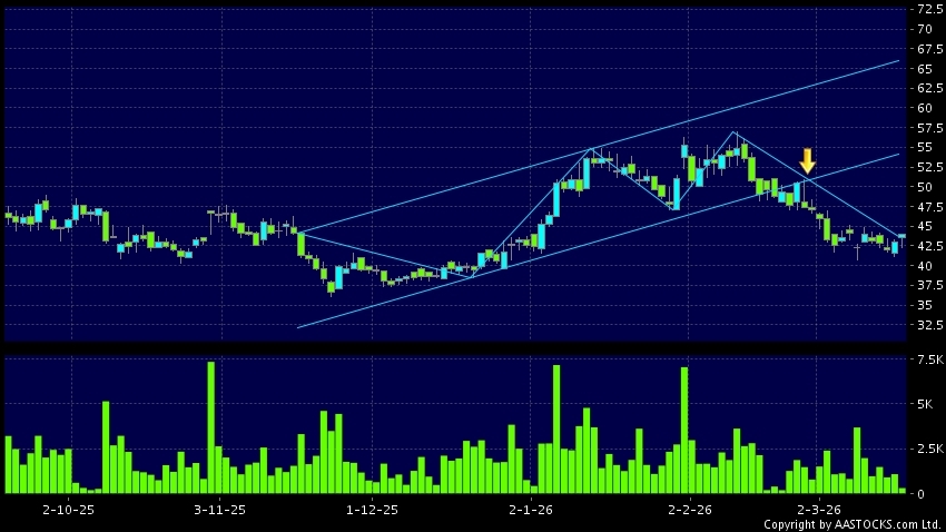 區域突破指股價在過去的一段時間只在一個範圍在內活動,然後股價下跌作出突破,跌穿區域的底部,技術走勢偏軟。(港股報價延遲最少十五分鐘。沽空資料截至 2026-03-23 16:25。)