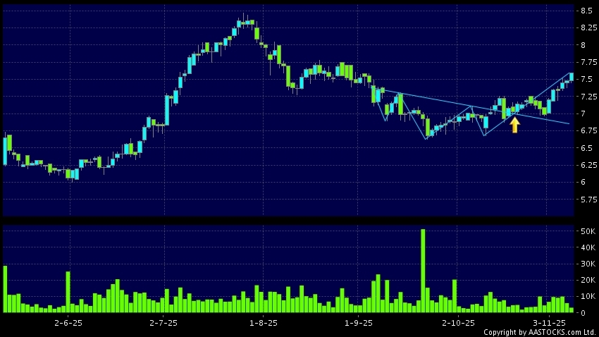 遠東宏信(03360.HK) +0.080 (+1.040%) 沽空 $7.84百萬; 比率 37.275% 呈現頭肩底向上突破,股價升穿頸線。現價報7.590,上升1.471%,成交量3.15百萬股,成交額2.38千萬。