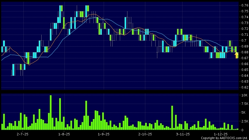 天津港發展(03382.HK) 0.000 (0.000%) 沽空 $8.04千; 比率 15.391% 10天移動平均線升穿20天移動平均線,出現黃金交叉。現價報0.670,下跌1.471%,成交量38.60萬股,成交額25.94萬。