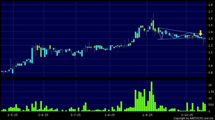中國金融發展(03623.HK) 0.000 (0.000%) 呈現三角形向下突破。現價報1.300,無升跌,成交量57.00萬股,成交額71.48萬。