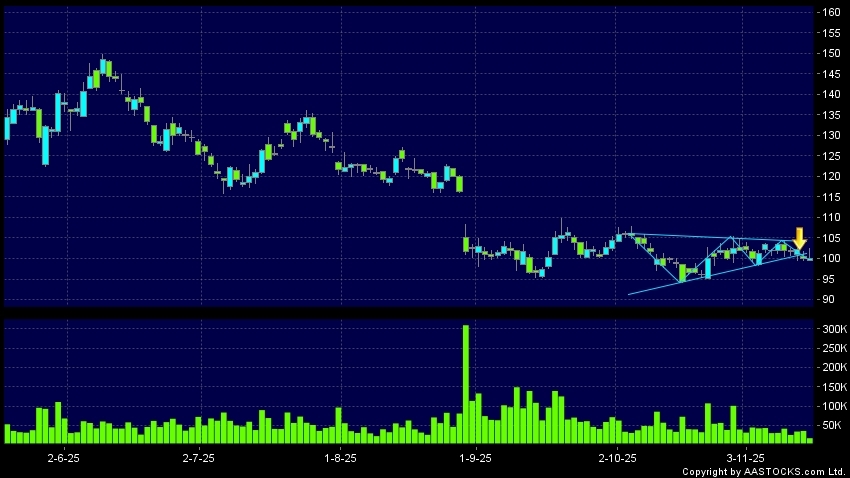 三角形向下突破是指股價的波幅漸漸收窄,在圖表上形成三角形般的狀態。股價在三角形的末端向下突破,下跌趨勢形成,技術走勢偏軟。(港股報價延遲最少十五分鐘。沽空資料截至 2025-11-18 12:25。)