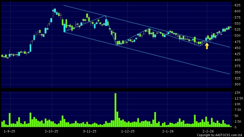區域突破指股價在過去的一段時間只在一個範圍在內活動,然後股價上升作出突破,升穿區域的頂部,技術走勢向好。(港股報價延遲最少十五分鐘。沽空資料截至 2026-02-23 16:25。)
