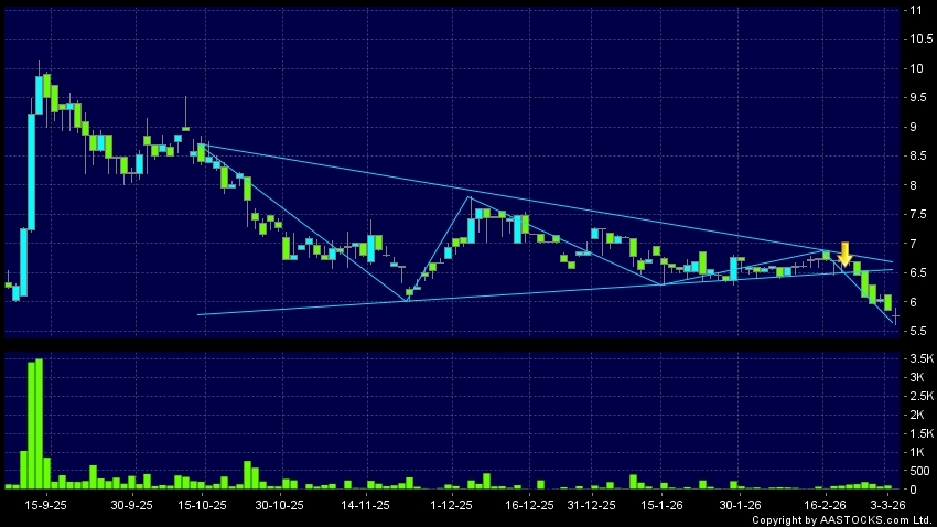 三角形向下突破是指股價的波幅漸漸收窄,在圖表上形成三角形般的狀態。股價在三角形的末端向下突破,下跌趨勢形成,技術走勢偏軟。(港股報價延遲最少十五分鐘。)