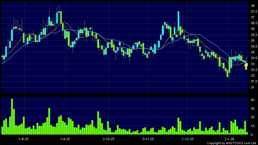 保利物業(06049.HK) -0.220 (-0.663%) 沽空 $1.17百萬; 比率 3.839% 10天移動平均線升穿20天移動平均線,出現黃金交叉。現價報33.040,下跌0.302%,成交量33.04萬股,成交額1.10千萬。