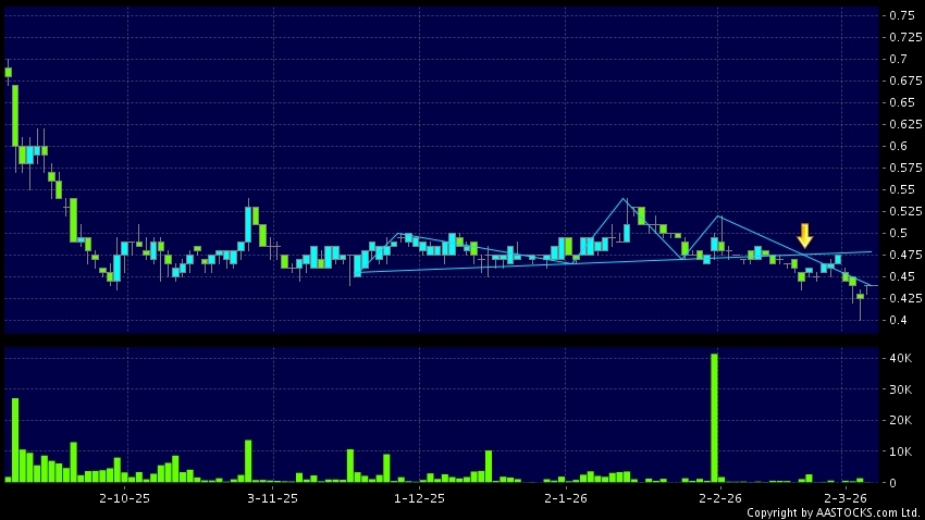 興證國際(06058.HK) +0.020 (+4.494%) 呈現頭肩頂向下突破。現價報0.440,無升跌,成交量2.00千股,成交額880.00。