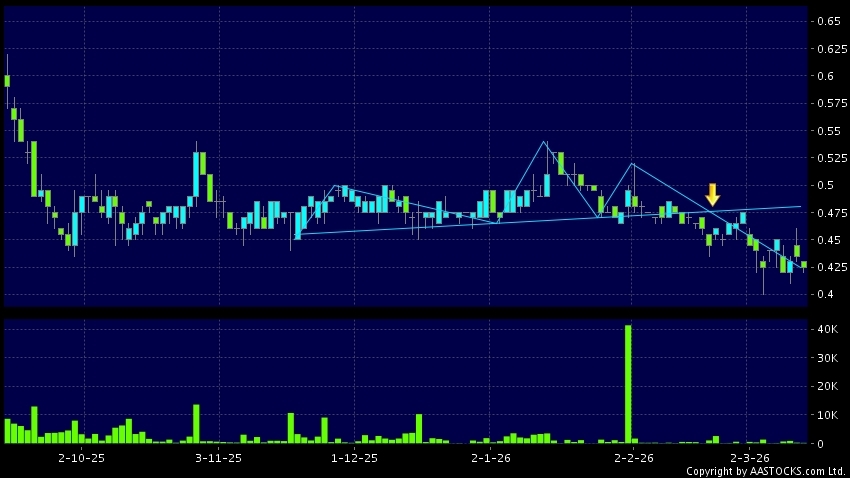 興證國際(06058.HK) +0.020 (+4.494%) 呈現頭肩頂向下突破。現價報0.425,下跌2.299%,成交量25.40萬股,成交額10.89萬。