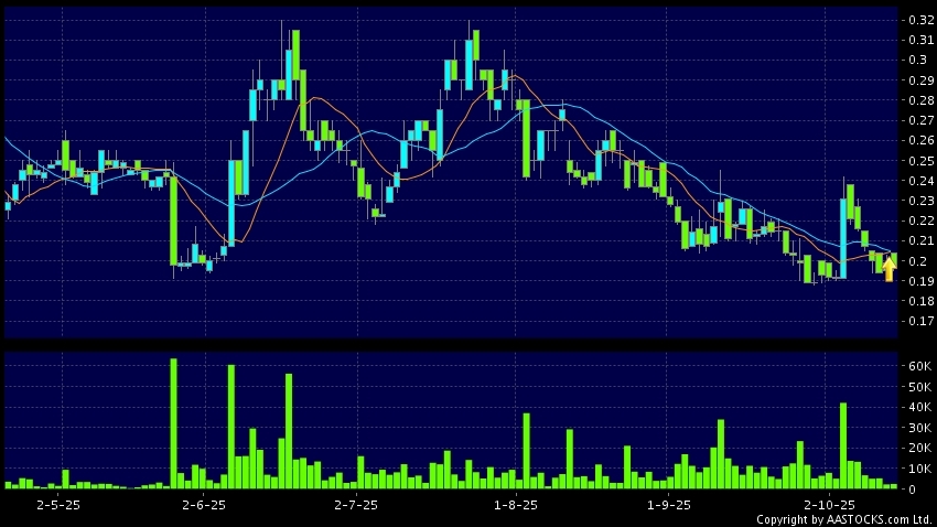 飛天雲動(06610.HK) -0.009 (-6.923%) 10天移動平均線升穿20天移動平均線,出現黃金交叉。現價報0.196,下跌1.508%,成交量2.48百萬股,成交額48.65萬。
