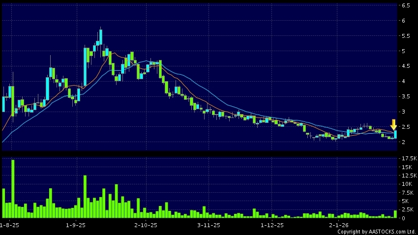 免責聲明:以上金融市場數據、報價、圖表 及/或各種技術分析指標乃根據公開資料分析和演釋自動生成的,僅作參考使用。此類自動生成的內容並不代表AASTOCKS.com Limited的立場。AASTOCKS.com Limited並不保證其準確性、完整性、實時性或者正確性。閣下應諮詢獨立專業意見,以核實定價資料或獲取更詳細的市場信息及須為所有跟隨此類自動生成的內容執行的交易或使用該內容負責。