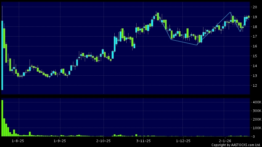 華新建材(06655.HK) +0.230 (+1.216%) 沽空 $1.52百萬; 比率 1.894% 呈現杯柄形向上突破。現價報18.910,下跌0.421%,成交量2.32百萬股,成交額4.38千萬。