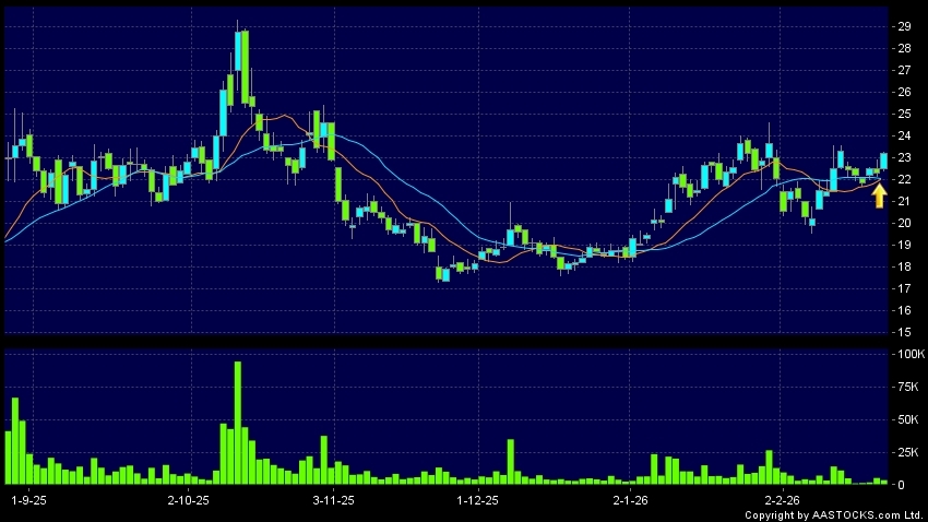 金力永磁(06680.HK) +1.620 (+6.784%) 沽空 $1.35千萬; 比率 3.048% 10天移動平均線升穿20天移動平均線,出現黃金交叉。現價報23.280,上升4.488%,成交量4.45百萬股,成交額1.02億。