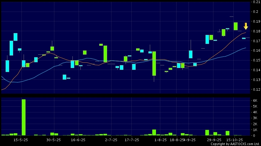 永順控股香港(06812.HK) -0.018 (-9.231%) 10天移動平均線跌穿20天移動平均線,出現死亡交叉。現價報0.173,無升跌,成交量0.00股,成交額0.00。
