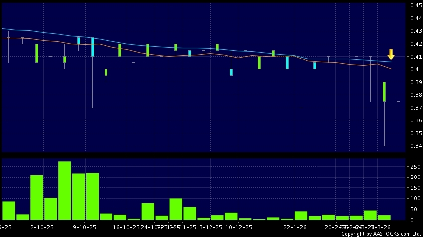 科勁國際(06822.HK) -0.010 (-2.500%) 10天移動平均線跌穿20天移動平均線,出現死亡交叉。現價報0.375,無升跌,成交量0.00股,成交額0.00。