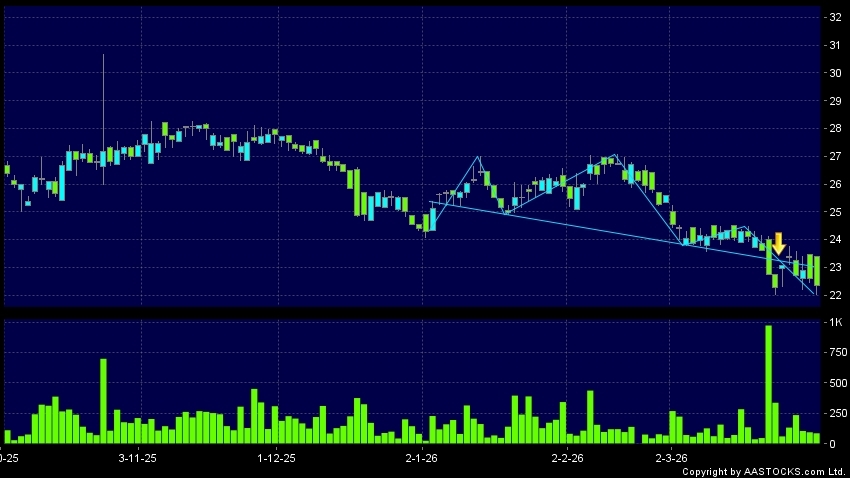 頭肩頂是典型的沽出訊號,當股價跌穿支持線(頸線)時,跌勢確認股價將持續下跌,技術走勢偏軟。(港股報價延遲最少十五分鐘。)