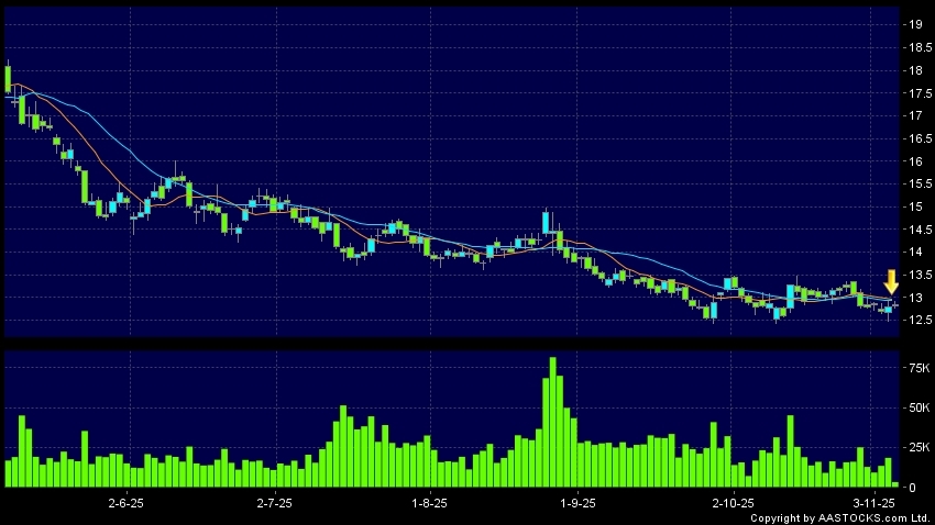 海底撈(06862.HK) +0.120 (+0.884%) 沽空 $2.47千萬; 比率 20.541% 10天移動平均線跌穿20天移動平均線,出現死亡交叉。現價報12.850,上升0.391%,成交量3.52百萬股,成交額4.52千萬。