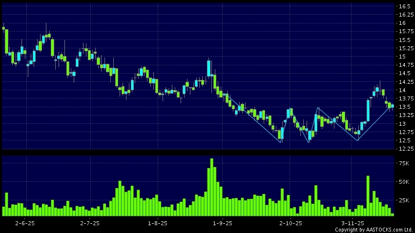 海底撈(06862.HK) +0.120 (+0.884%) 沽空 $2.47千萬; 比率 20.541% 呈現三重底突破向上。現價報13.550,上升0.669%,成交量7.49百萬股,成交額1.01億。