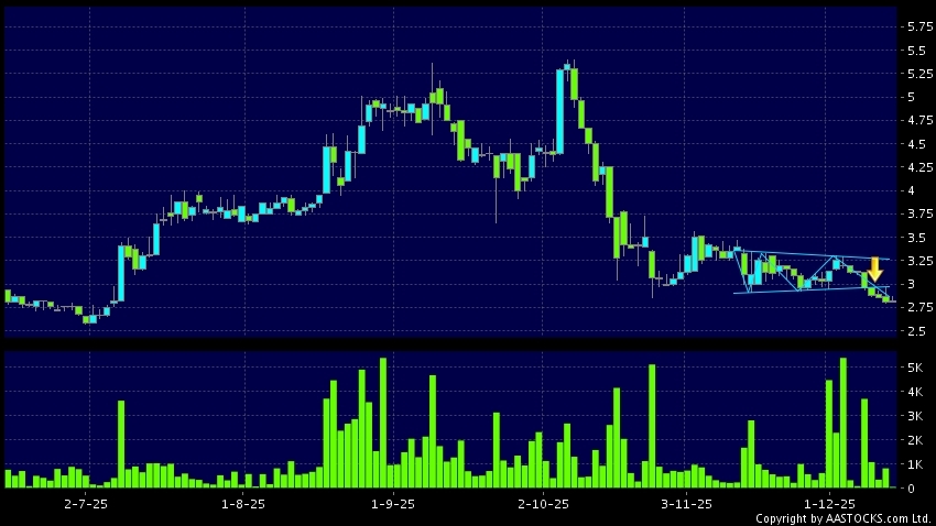 三角形向下突破是指股價的波幅漸漸收窄,在圖表上形成三角形般的狀態。股價在三角形的末端向下突破,下跌趨勢形成,技術走勢偏軟。(港股報價延遲最少十五分鐘。)