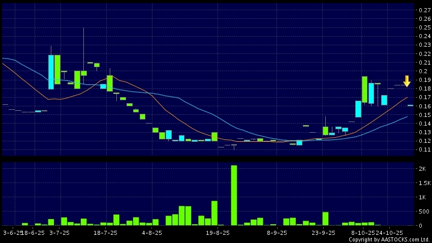 易通訊集團(08031.HK) -0.023 (-12.500%) 10天移動平均線跌穿20天移動平均線,出現死亡交叉。現價報0.161,下跌12.500%,成交量1.00萬股,成交額1.60千。