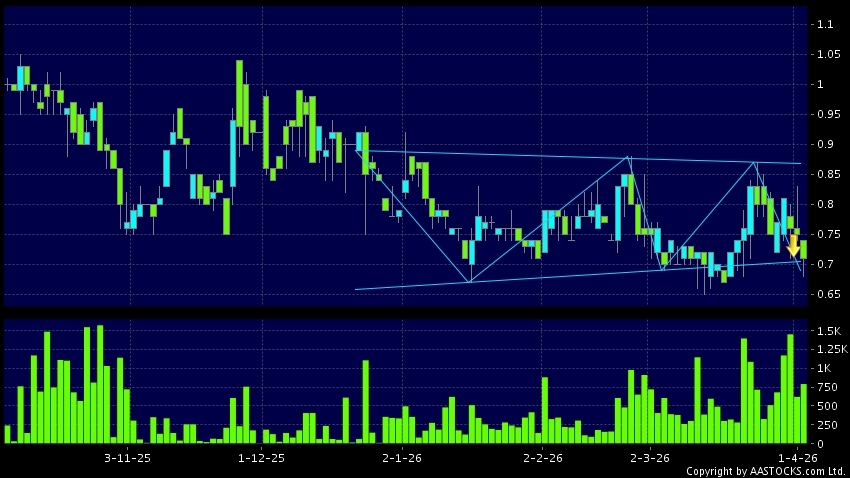 三角形向下突破是指股價的波幅漸漸收窄,在圖表上形成三角形般的狀態。股價在三角形的末端向下突破,下跌趨勢形成,技術走勢偏軟。(港股報價延遲最少十五分鐘。)