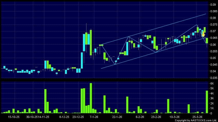 高奧士國際(08042.HK) 0.000 (0.000%) 呈現區域下軌突破。現價報0.060,下跌13.043%,成交量4.57百萬股,成交額27.91萬。