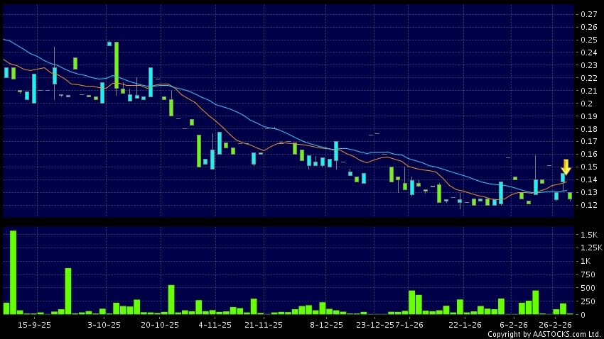 生活概念(08056.HK) 0.000 (0.000%) 10天移動平均線跌穿20天移動平均線,出現死亡交叉。現價報0.125,下跌13.793%,成交量2.00萬股,成交額2.53千。