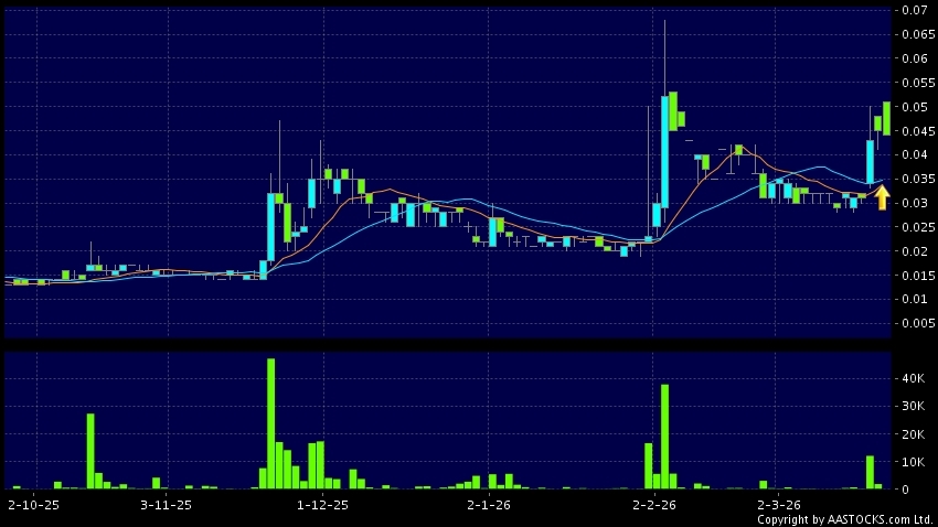 朝威控股(08059.HK) -0.004 (-11.111%) 10天移動平均線升穿20天移動平均線,出現黃金交叉。現價報0.044,下跌2.222%,成交量4.00萬股,成交額1.83千。