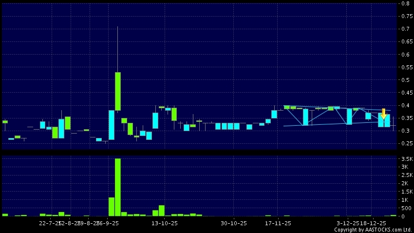 東方大學城控股(08067.HK) 0.000 (0.000%) 呈現三角形向下突破。現價報0.320,下跌12.329%,成交量7.30萬股,成交額2.27萬。