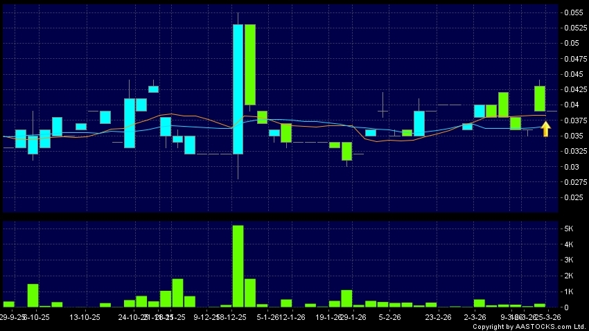 奧傳思維控股(08091.HK) 0.000 (0.000%) 10天移動平均線升穿20天移動平均線,出現黃金交叉。現價報0.039,無升跌,成交量0.00股,成交額0.00。