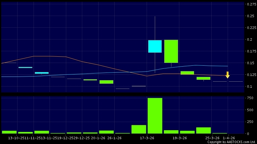 毅高國際控股(08218.HK) 0.000 (0.000%) 10天移動平均線跌穿20天移動平均線,出現死亡交叉。現價報0.110,無升跌,成交量0.00股,成交額0.00。
