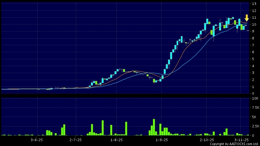首都金融控股(08239.HK) +0.030 (+0.281%) 10天移動平均線跌穿20天移動平均線,出現死亡交叉。現價報9.130,下跌7.591%,成交量21.13萬股,成交額1.92百萬。